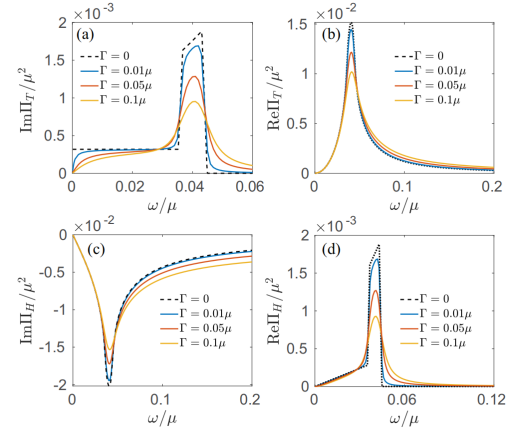 1:不同杂质散射下横向[(a)-(b)]和霍尔[(c)-(d)]响应函数随频率的变化。