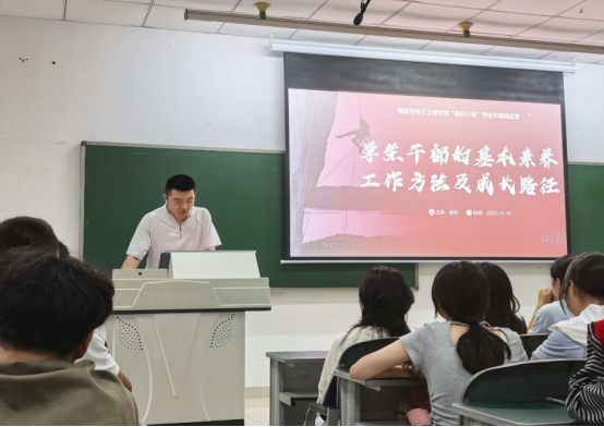 为帮助2025级学生干部明晰角色定位、提升履职能力,明确成长方向,10月10日下午,物理与电子工程学院在成龙校区第一教学楼A115教室举行2025年秋季第一期“强芯计划”学生干部培训活动,本次活动由学院分团委书记、学工办主任、2025级辅导员李科担任主讲人,2025级1、7、8、9班全体班委参与培训。