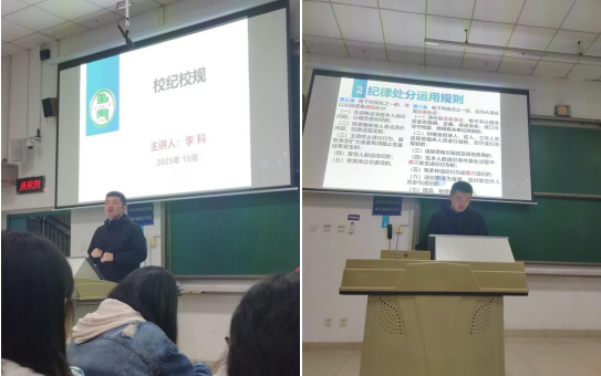 为进一步强化2025级新生纪律意识,10月19日晚,物理与电子工程学院本科2025级1、7、8、9班在成龙校区第一教学楼C302教室组织开展”校纪校规”专题教育活动,本次活动由2025级辅导员李科担任主讲人,学院2025级1、7、8、9班全体学生准时参与。