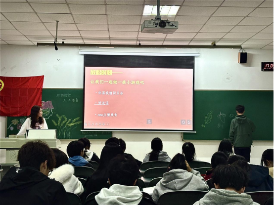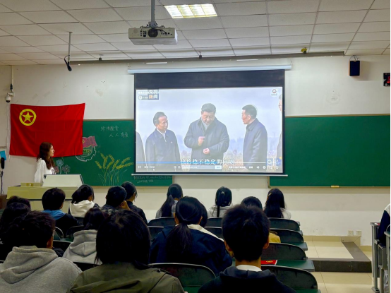 活动伊始,激昂的团歌旋律响彻全场,团员们身姿挺拔、精神饱满,齐声高唱《光荣啊,中国共青团》。熟悉的旋律、坚定的歌声,不仅展现了青年团员的蓬勃朝气,更让“为共产主义事业而奋斗”的信念在传唱中深化,为本次活动注入了强劲的精神力量。接着,通过一段纪录片让同学们回溯历史,深刻体会在那段为生存苦苦挣扎的岁月里,百姓食不果腹,生存举步维艰,侵华日军的大肆掠夺加剧了粮食危机。然而,无数先辈以拼搏奋进的姿态,在粮田之间开展大生产运动,缓解粮食压力,彰显了中国人民英勇无畏的精神风骨。随后,同学们共同学习了习近平总书记围绕粮食安全发表的一系列重要论述,深刻领会“粮食安全是关系国运民生的‘压舱石’”这一核心要义。