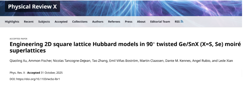 近日,我校物理与电子工程学院青年教师徐巧玲与钱塘高等研究院的冼乐德教授,以及德国马克斯·普朗克研究所、美国宾夕法尼亚大学、德国亚琛工业大学等国际团队合作,在国际物理学顶尖期刊Physical Review X(中科院一区TOP,《自然科学类高水平期刊目录》中T3级期刊)上发表了题为《Engineering 2D square lattice Hubbard models in 90° twisted Ge/SnX (X=S, Se) moiré superlattices》的研究论文(DOI: https://doi.org/10.1103/wcbz-lbr1),arXiv网站(http://arxiv.org/abs/2406.05626)。徐巧玲为该论文的第一作者,四川师范大学物理与电子工程学院为第一署名单位。