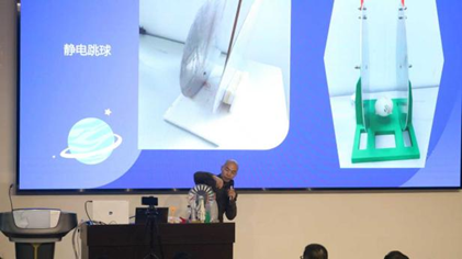 接下来,树德中学屈川老师以“静电研究历史与实验”为主题,以人物为线索,梳理了静电的探索脉络,并展示了电子验电器、静电跳球、静电马达等多种自制电学仪器,引发了同学们的浓厚兴趣,也把好奇心装进了每一位同学的心里,赢得了同学们的热烈掌声。