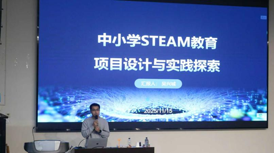 接着,石室中学吴兴城老师就“中小学STEAM教育项目设计与实践探索”展开分享,阐述了STEAM的核心内涵、课程设计等相关要点,分享了室内二氧化碳自动检测换气装置等实践案例,给同学们呈现了可复制、可迁移的课程设计路径。