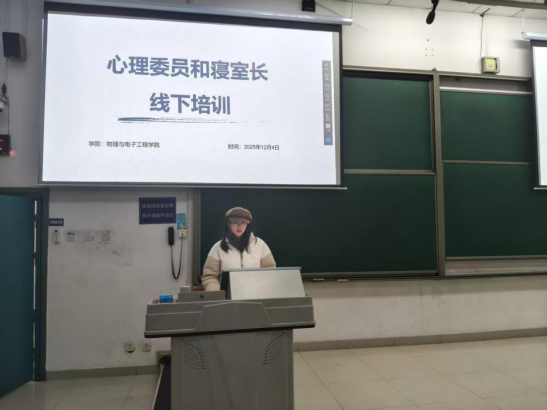 2025年12月4日中午,物理与电子工程学院在成龙校区第一教学楼C102教室成功举办了心理健康专题培训会。学院党委副书记、纪委书记钟亚秋,学院心理辅导站指导老师、2025级辅导员蒲禹潼老师出席,2025级全体寝室长及各年级心理委员参加。本次培训会由学院心理服务部主办,心理服务部负责人陈若涵主讲。