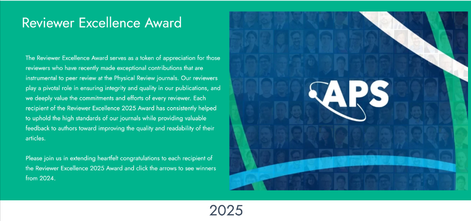 “审稿人卓越奖”是美国物理学会为表彰在其旗下《物理评论》系列期刊的同行评审中做出杰出贡献的审稿人而设立的荣誉。同行评审是保障学术质量与诚信的核心环节,审稿人以其深厚的学识和严谨的态度,为维护期刊的学术水准、提升论文质量提供了不可或缺的专业支持。获奖者不仅展现了高水平的学术判断力,更以其建设性的评审意见,切实帮助全球研究者精炼成果、推动学科进步。
