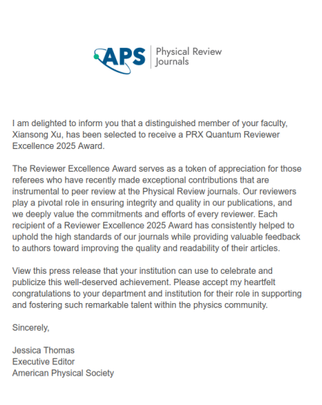 近日,我院教师许仙松荣获美国物理学会颁发的2025年“审稿人卓越奖”(https://promo.aps.org/Reviewer-Excellence)。此奖项是国际物理学界对学者在学术评审工作中卓越贡献与专业精神的高度认可。此次美国物理学会期刊PRX Quantum全球共5人获奖,分别是Margarita Davydova(加州理工学院)、Steven M.Girvin(耶鲁大学量子研究所)、Timothy Proctor(桑迪亚国家实验室)、Xiansong Xu许仙松(四川师范大学)、Adam Zalcman(谷歌量子人工智能实验室)。